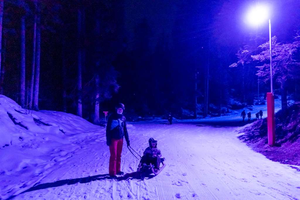 Auch in der Region Seefeld ist für eine Portion Adrenalin gesorgt: beim Nachtrodeln am Katzenkopf in Leutasch. Der Sessellift ist von unserer Unterkunft (mehr dazu weiter unten) nur einen Katzensprung entfernt. So finden wir uns nach dem Abendessen mit unseren Schlitten schnell an der Talstation wieder.